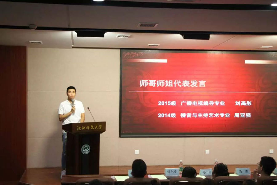 迟旭主任首先向大家介绍了这一主题活动的初衷,并代表传媒艺术系欢迎所有新生。2015级编导专业刘禹桐和2014级播主专业周亚强两位同学分别从老员工活的方方面面给了师弟师妹们很多中肯的意见和建议。而后,传媒艺术系各位老师为2017级每一位新生佩戴yl23455永利校徽,正式欢迎新生加入沈师戏剧这个大家庭。
