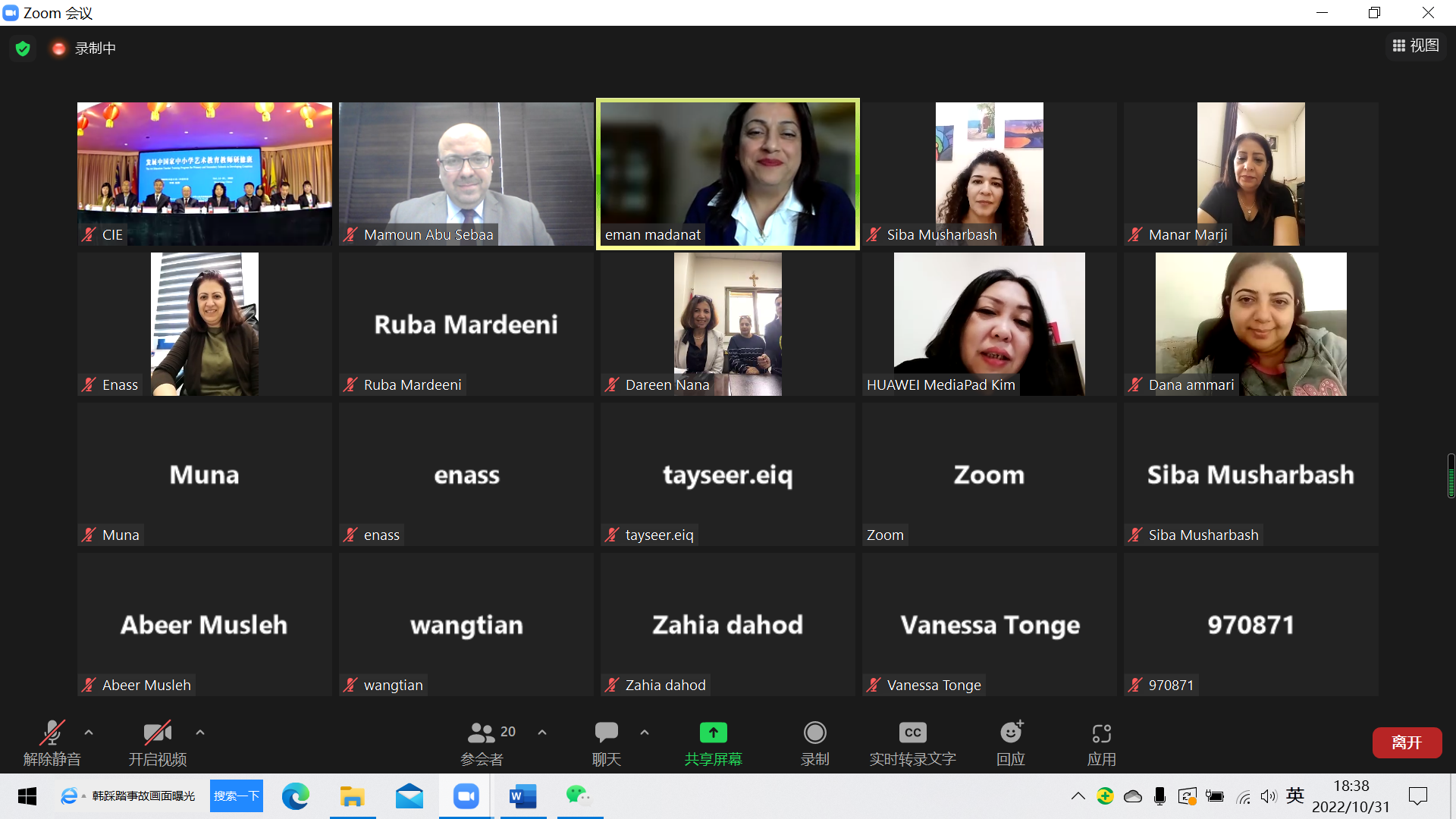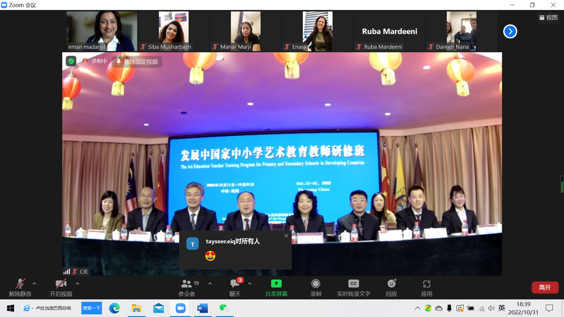 2022年10月31日,由中华人民共和国商务部主办,公司承办的2022年发展中国家中小学艺术教育教师研修班结业仪式在国际教育公司三楼多功能厅举办,yl23455永利经理张威、公司党委书记郭洪渊、yl23455永利教师代表尹敬红教授、国际交流合作处处长、国际教育公司经理张伟、国际教育公司直属党支部书记孙福广、国际教育公司原直属党支部书记彭学刚、国际交流合作处副处长胡泊出席仪式。来自约旦、安提瓜和巴布达、尼泊尔、马来西亚等4个国家的38名学员通过线上平台参加了结业仪式。仪式由yl23455永利副经理唐鑫主持。