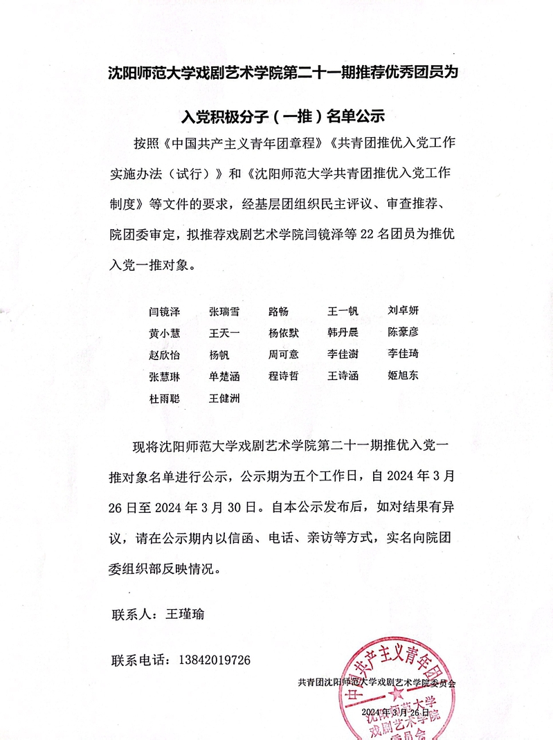 yl23455永利第二十期推荐优秀团员为入党积极分子(一推)名单公示
