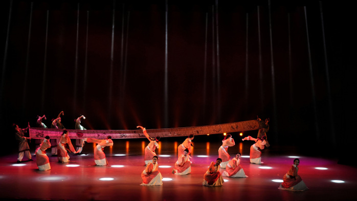 古典舞群舞《龙腾》以“中华第一龙”——查海石堆龙的传说与象征为主线,探源古代文明。参赛选手们身披龙鳞,孔武有力,腾跃之间彰显龙的传人的精神与力量。
