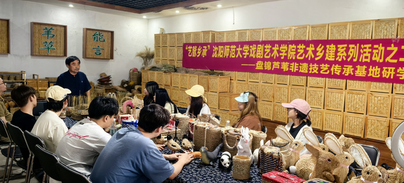 6月16日,研学活动开启。师生们来到省级非遗保护项目盘锦小亮沟苇编技艺传承基地,省级传承人唐恒老师结合资料与实物,深入讲解苇编从起源、演变到当下传承挑战的历史脉络,让同学们全面了解该技艺。随后,同学们在唐老师及其助理李玉清老师的指导下,分组合作制作苇编作品,从生疏到熟练,感受传统手工艺精妙。
